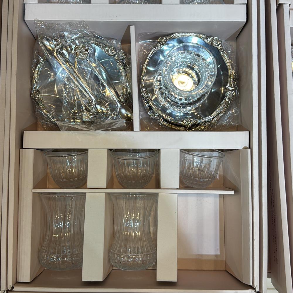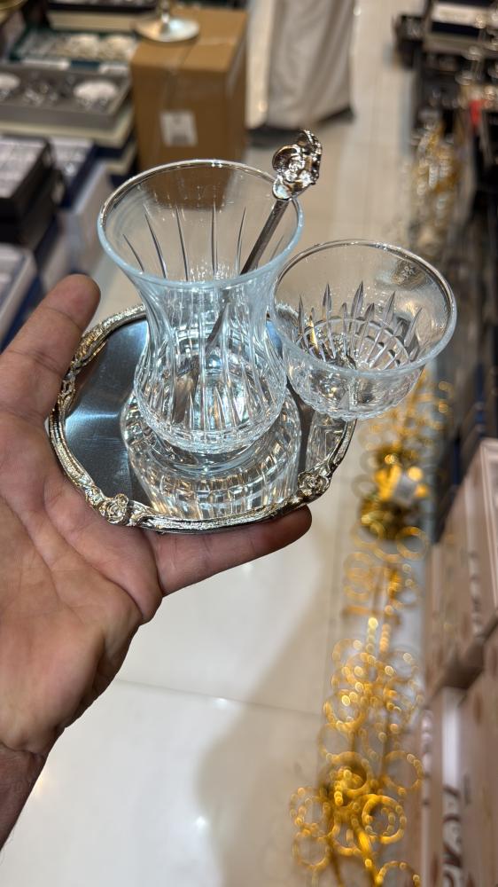 يأتي الطقم بكوبين زجاجيين شفافين يبرزان لون الشاي الجميل، موضوعين على صحون معدنية بتفاصيل زخرفية راقية، مع ملاعق مزينة بزهرة فخمة تضيف لمسة من الجمال لكل جلسة شاي.