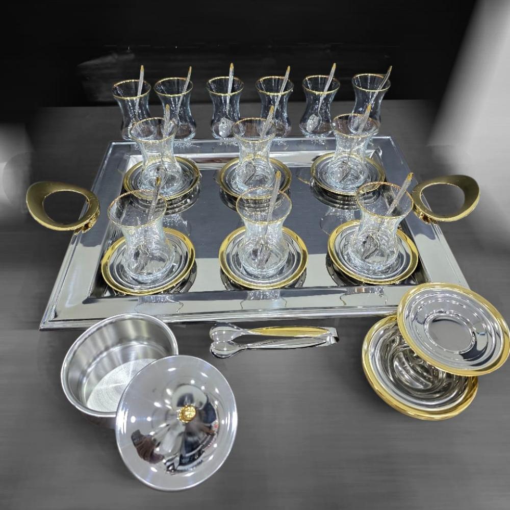 الصينية الاستيل اللامعة، والكاسات بتفاصيلها الذهبية، والسكرية المتكاملة… كلها تكتمل في قطعة واحدة ترفع قيمة أي جلسة ضيافة.