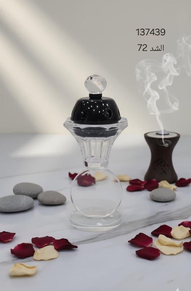 مبخرة بتصميم راقٍ يجمع بين الفخامة والبساطة، مصنوعة من الكريستال الشفاف الفاخر مع غطاء أسود لامع يضيف لمسة من الأناقة والتميز.
