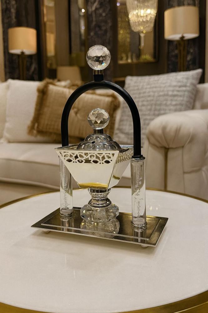ج في الصورة هو مبخرة كريستال وفضة. تتميز هذه المبخرة بتصميمها الأنيق الذي يجمع بين المعدن اللامع والزجاج الشفاف، مما يمنحها مظهرًا فاخرًا.